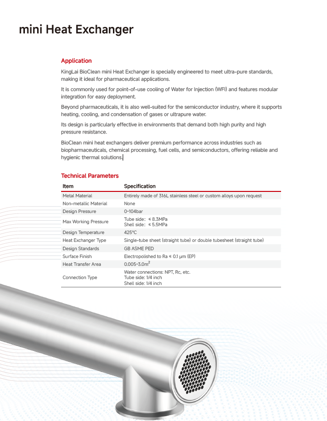 KingLai BioClean mini Heat Exchanger is specially engineered to meet ultra-pure standards,