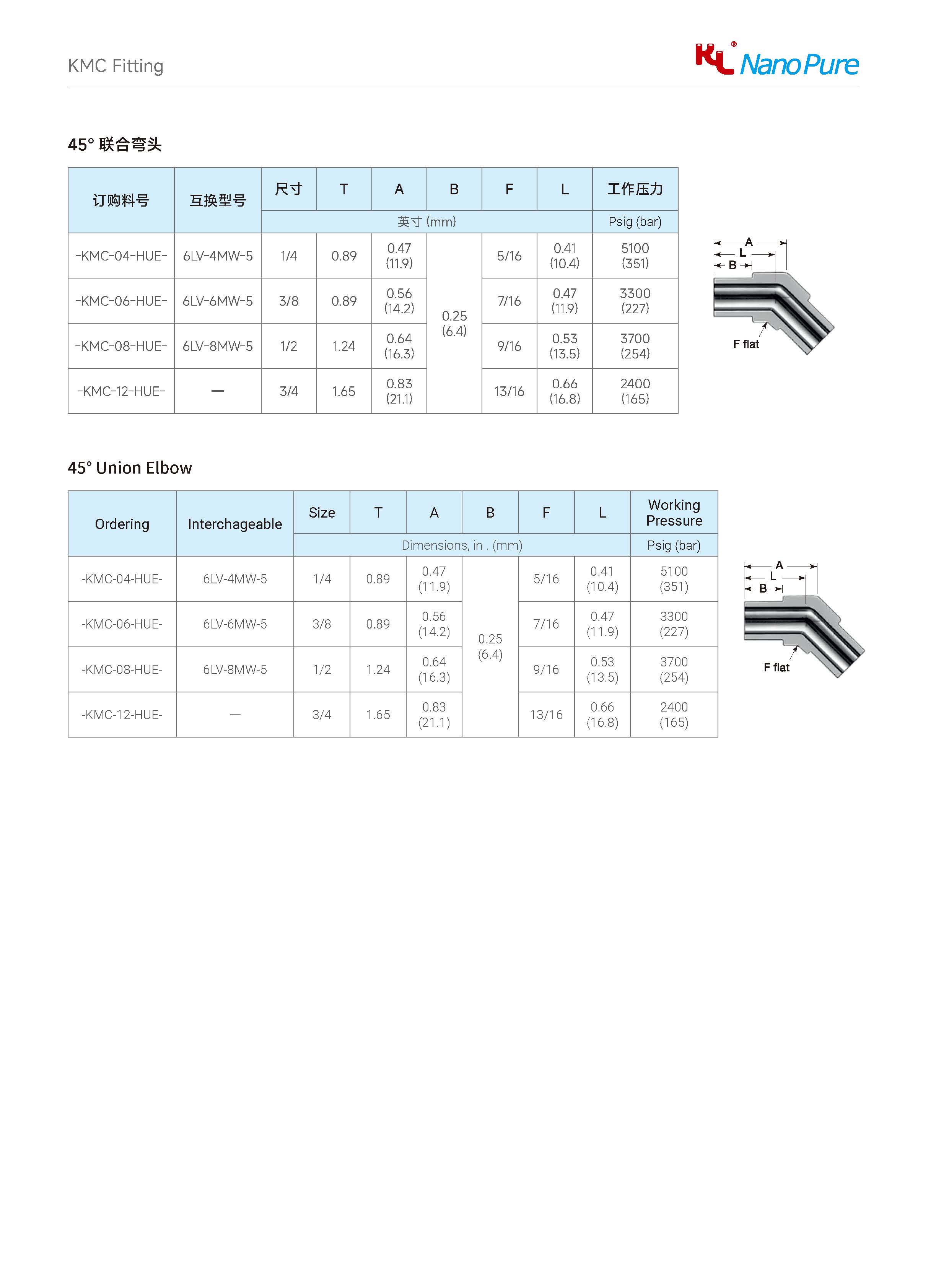 Please check on the below page and Meets the KLC 45° Union Elbow various sizes & specifications, The Nanopure ordering number available with size selection.