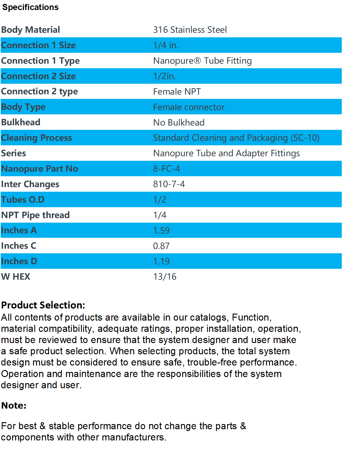 Stainless Steel Nanopure Tube Fitting, Female Connector, 1/4 in. Tube OD x 1/2 in. Female NPT