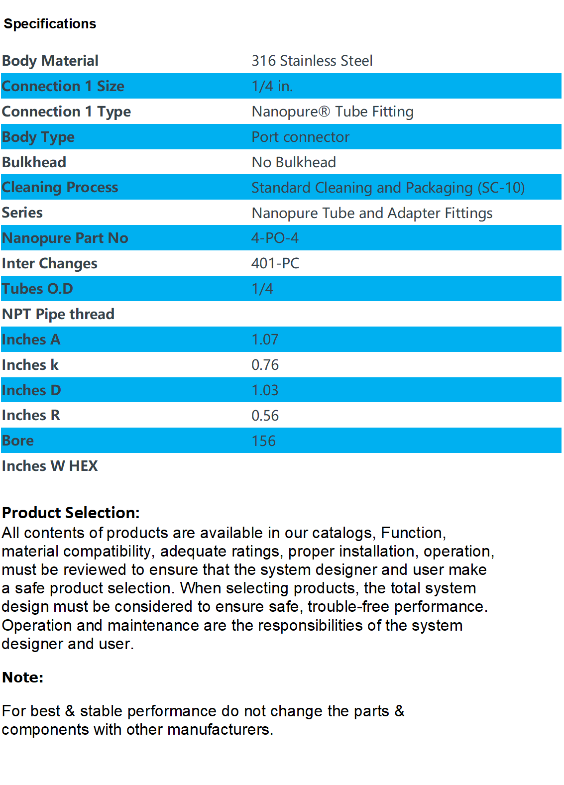 Stainless Steel Nanopure Tube Fitting, Port Connector, 1/4 in. Tube OD