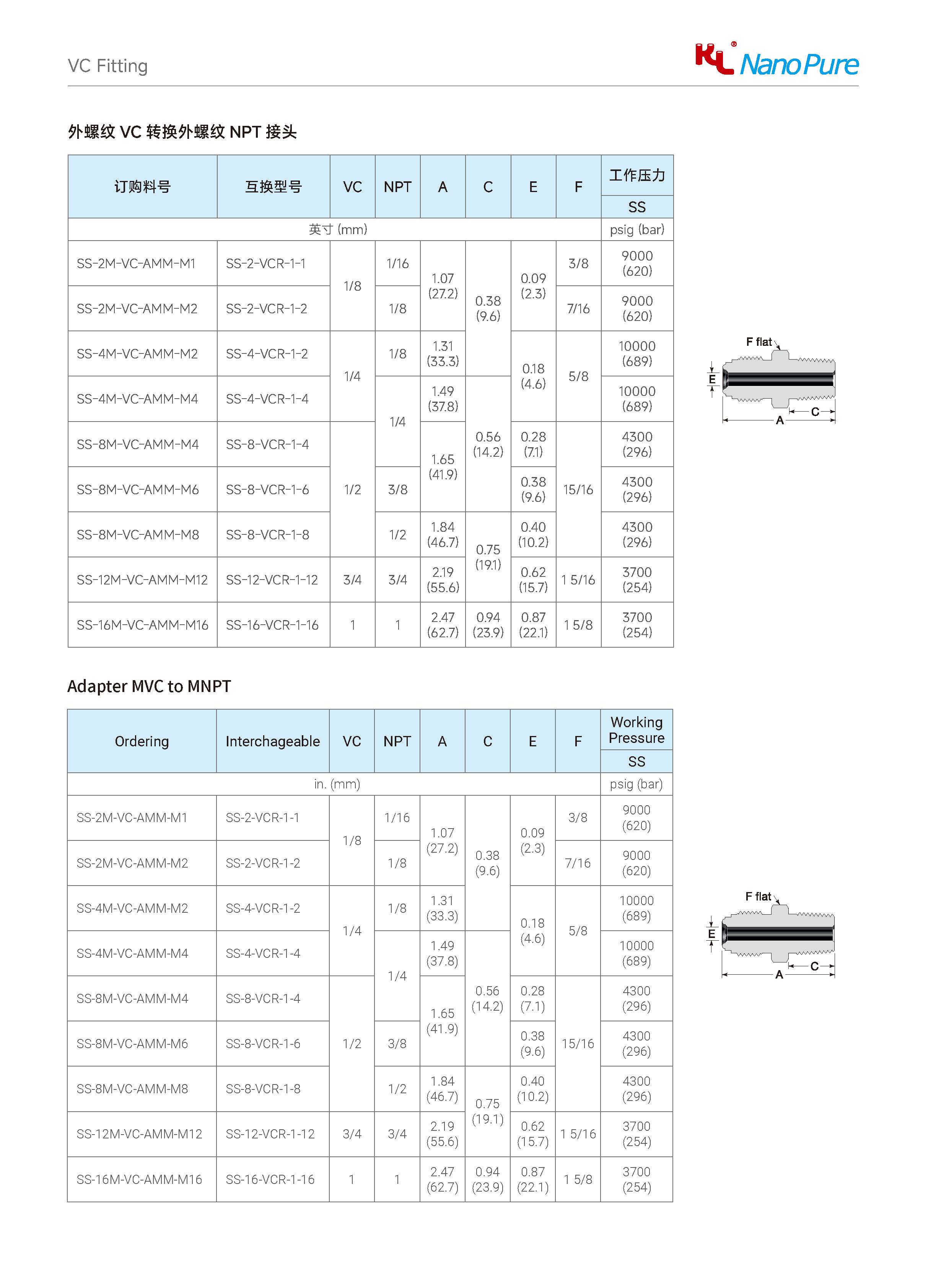 Please check on the below page and Meets the VC Adapter MVC to MNPT various sizes & specifications, The Nanopure ordering number available with size selection.