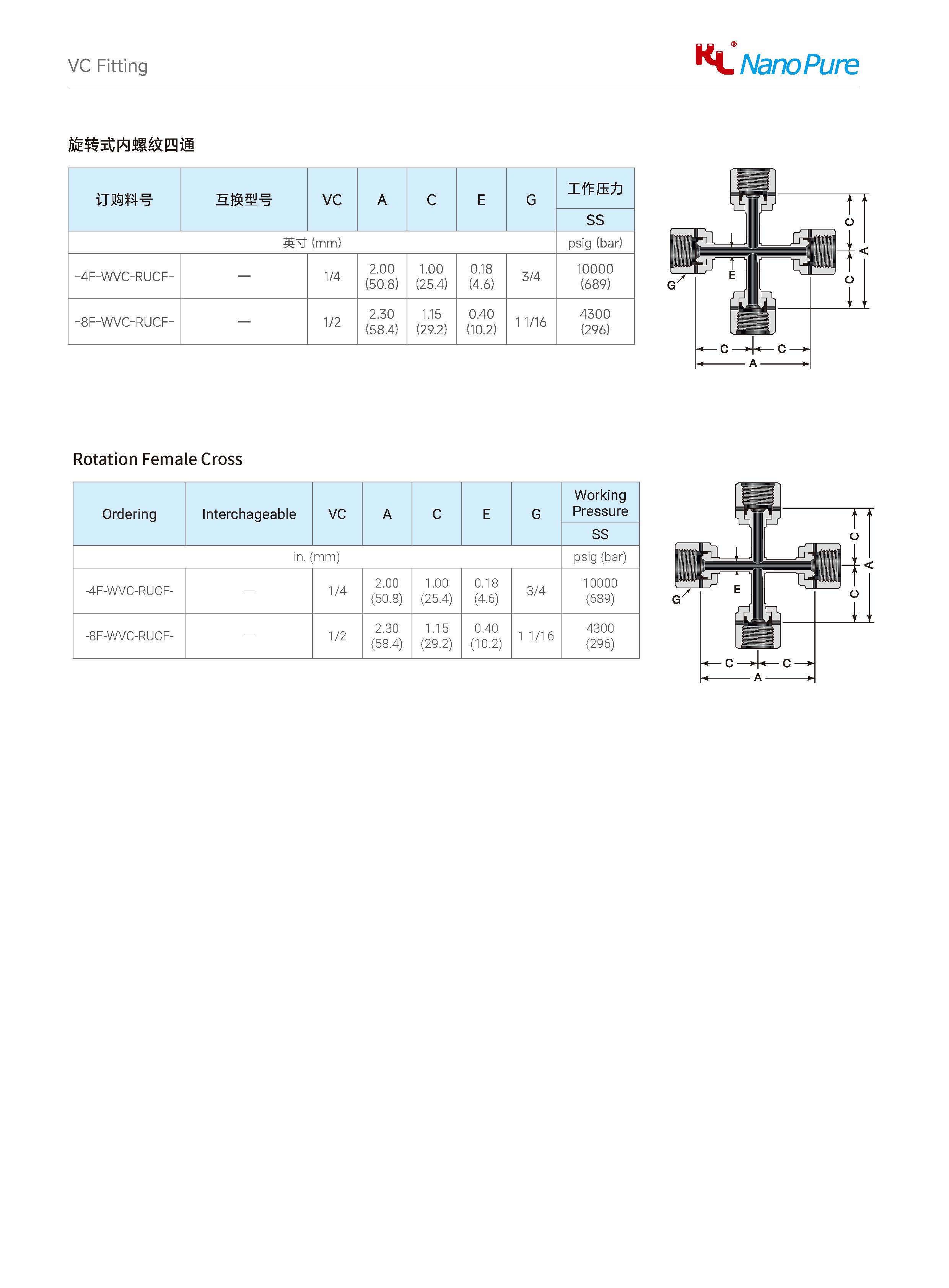 Please check on the below page and Meets the VC Rotation Female Cross Gland various sizes & specifications, The Nanopure ordering number available with size selection.