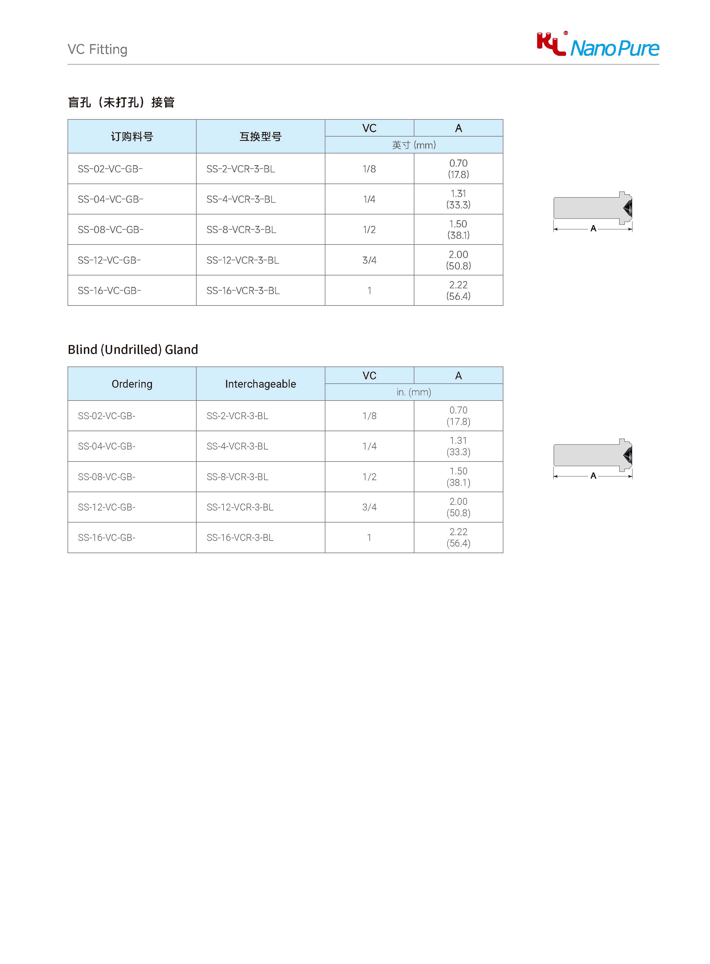 Please check on the below page and Meets the VC Blind (Undrilled) Gland various sizes & specifications, The Nanopure ordering number available with size selection.