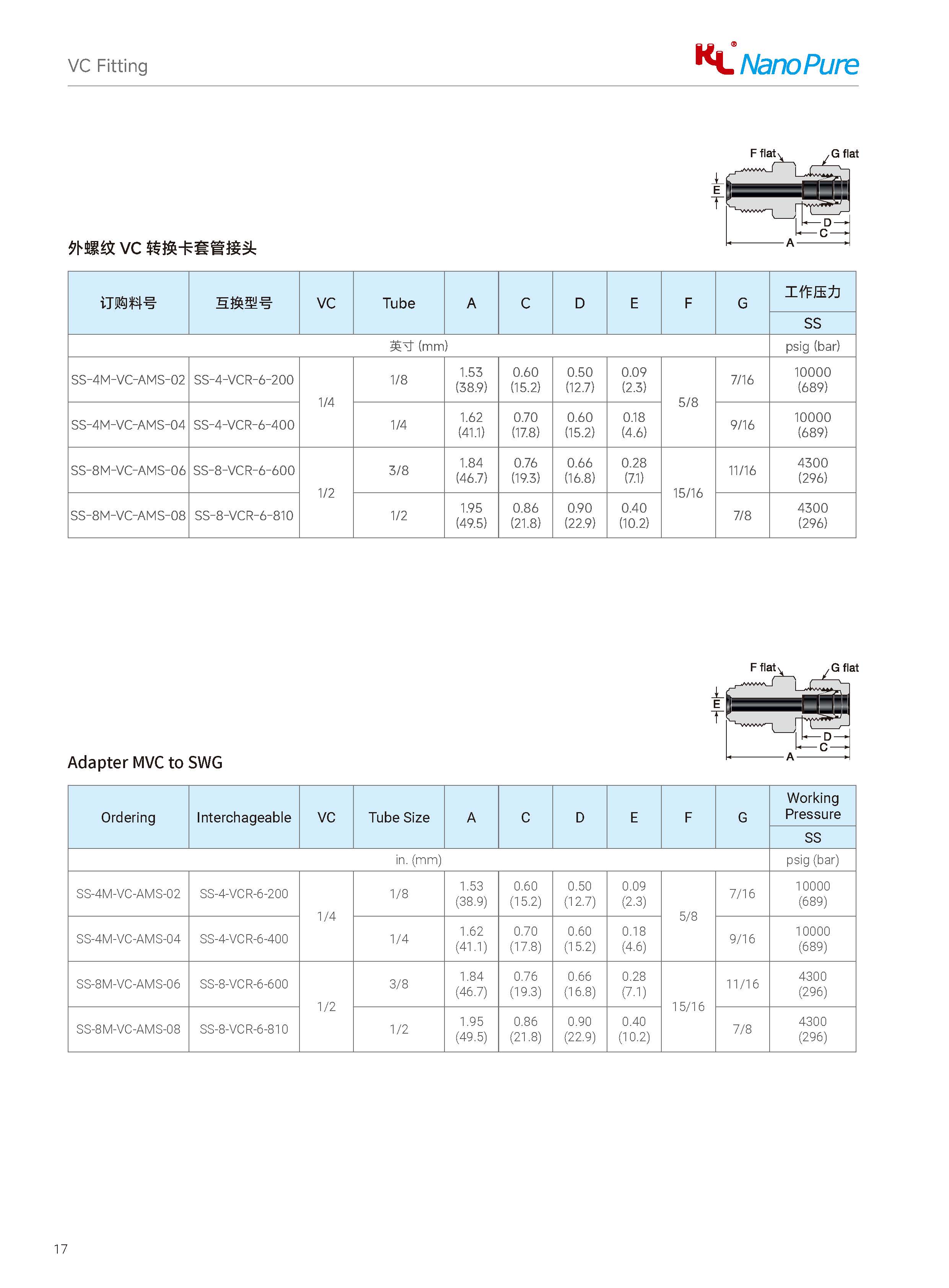 Please check on the below page and Meets the VC Adapter MVC to SWG various sizes & specifications, The Nanopure ordering number available with size selection.